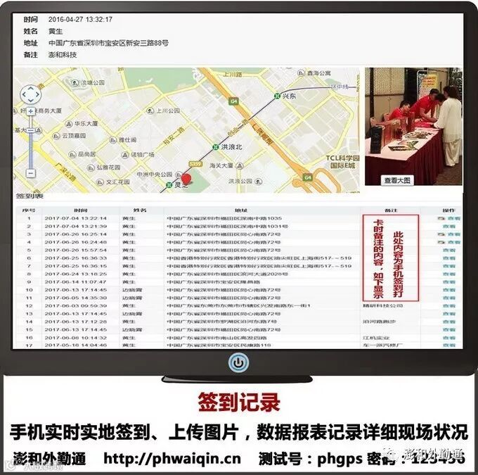远程签到:可根据实际需要进行手机的远程签到打卡,随时上报位置及照片信息。