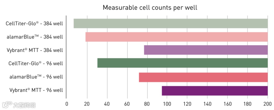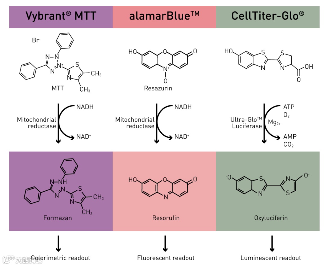 图1. Vybrant MTT、alamarBlue和CellTiter-Glo的细胞活性检测原理