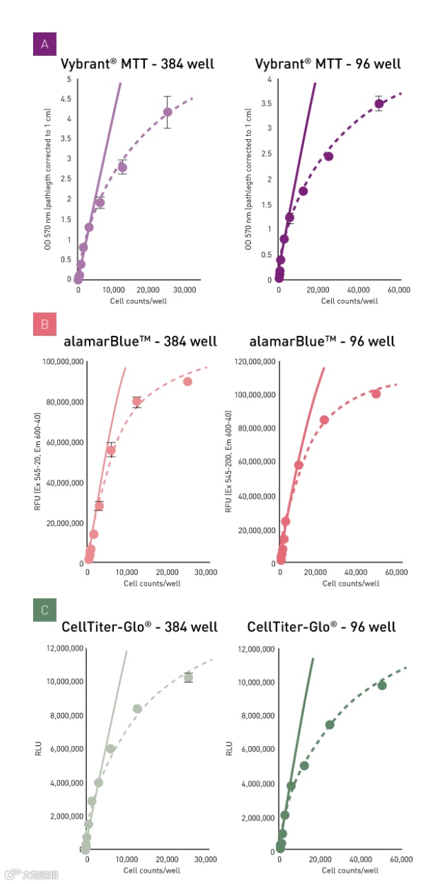 图3. 384孔和96孔板的HeLa细胞活性标准曲线。(A)Vybrant MTT,Abs(B)AlamarBlue,FI(C)CellTiter-Glo,Lum。误差线代表8次重复