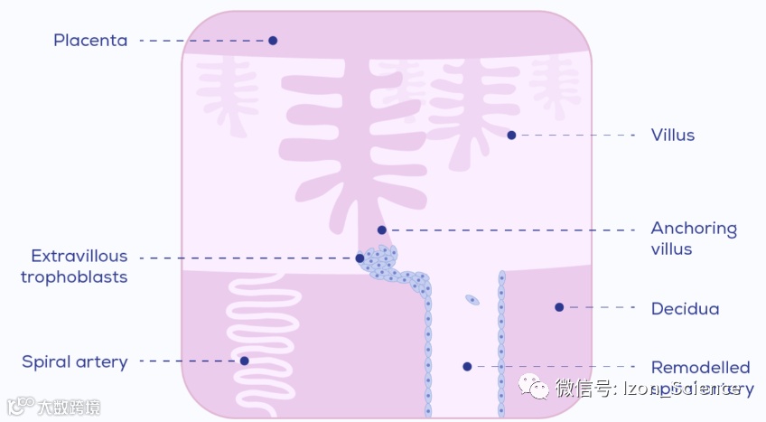 图1. 螺旋动脉重建示意图。绒毛外滋养细胞(EVTs)从胎盘绒毛的顶端向外迁移,侵入蜕膜螺旋动脉。在这里,它们与免疫细胞一起将动脉重塑为宽的,高导的,低压的血管。EVTs排列在重塑血管的管腔内,取代内皮。在子痫前期,这种重构是不完全的,没有到达肌层,留下高压,低导的血管,如图像左侧所示的螺旋动脉。