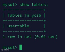 create database ycsb;use ycsb;CREATE TABLE usertable (YCSB_KEY VARCHAR(255) PRIMARY KEY,FIELD0 TEXT, FIELD1 TEXT,FIELD2 TEXT, FIELD3 TEXT,FIELD4 TEXT, FIELD5 TEXT,FIELD6 TEXT, FIELD7 TEXT,FIELD8 TEXT, FIELD9 TEXT);