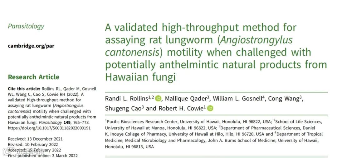 来自于美国夏威夷大学太平洋生物科学研究中心的研究人员开发了一种基于WMicrotracker系统的运动分析功能的高通量生物体筛查方法。通过使用夏威夷真菌提取物对广州管圆线虫三期幼虫的驱虫活性进行了筛选,并根据运动减少的程度进行分类。