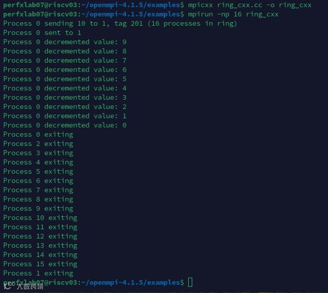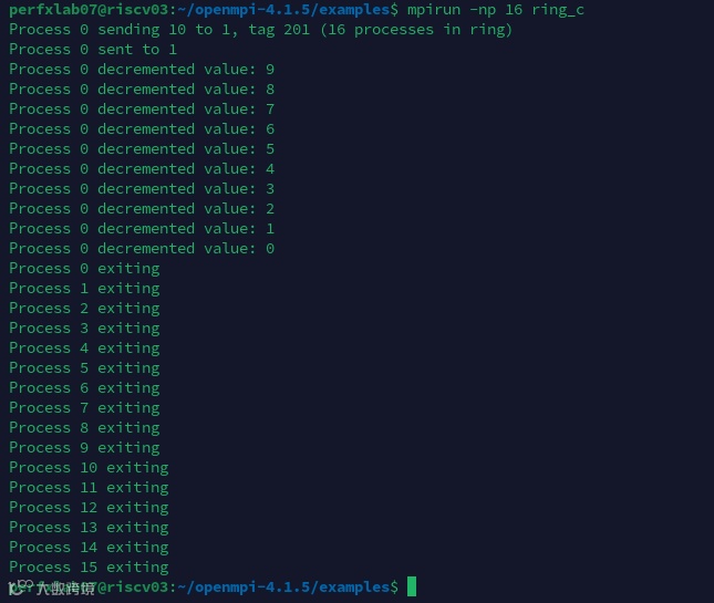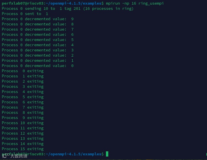 执行mpirun -np 16 ring_usempi,如果出现以下内容就说明编译成功。