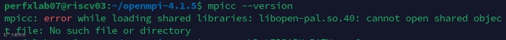 4. 接下来尝试运行mpicc并查看版本号,结果提示libopen-pal出现错误: