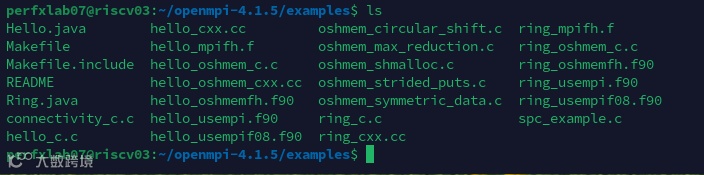5. OpenMPI提供了不少的示例代码供我们测试,涵盖了C、C++,甚至还有Java语言(是的,你没看错,还有Java语言,比如Hello.java文件等),不过在本教程中我们暂时不用Java,我们只用到C和C++代码。