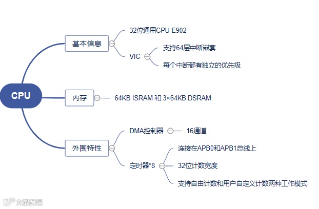 Wujian100搭载基于 RISC-V 架构的玄铁902处理器,兼容兼容RV32EMC/RV32EC/RV32IMC指令集,采用两级极简流水线,适用于对功耗和成本极其敏感的IoT应用。