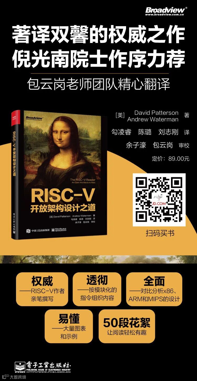 【参与方式】工作人员将从直播评论中抽取10名幸运观众,每人赠送一本由RISC-V发明人David Patterson和Andrew Waterman编著,中科院计算所包云岗老师团队翻译,倪光南院士作序,包云岗老师签名的新书《RISC-V开放架构设计之道》。