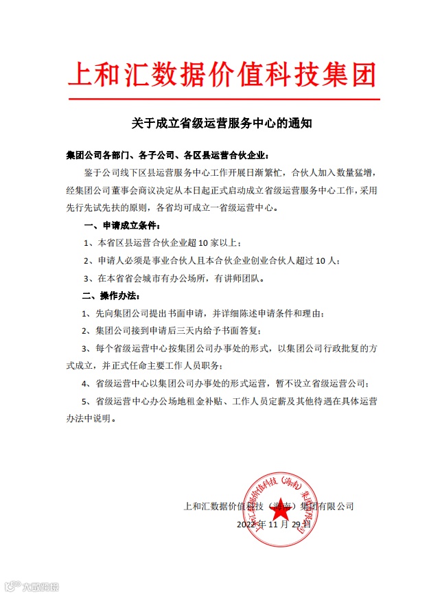 鉴于公司线下区县运营服务中心工作开展日渐繁忙,合伙人加入数量猛增,经集团公司董事会商议决定从本日起正式启动成立省级运营服务中心工作,采用先行先试先扶的原则,各省均可成立一省级运营中心。