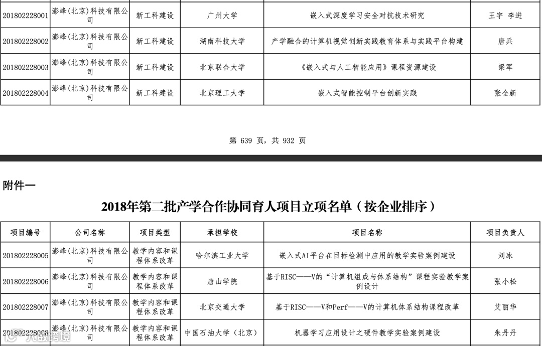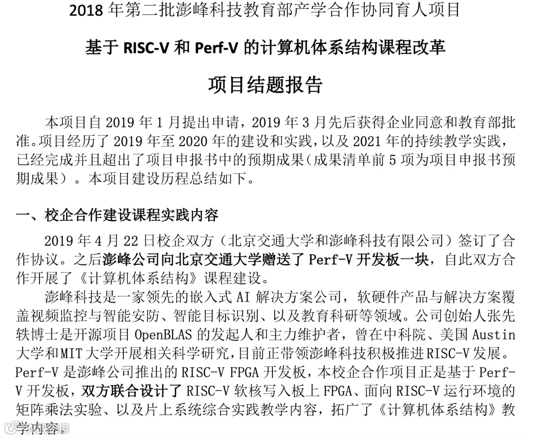 2018年,澎峰科技以Perf-V(RISC-V FPGA开源硬件平台)加入到教育部产学合作育人项目。与国内八所高校建立合作(北理、北交、北京联合大学、、中国石油大学、哈工大、唐山学院、湖南科技大学和广州大学),取得了丰硕成果。