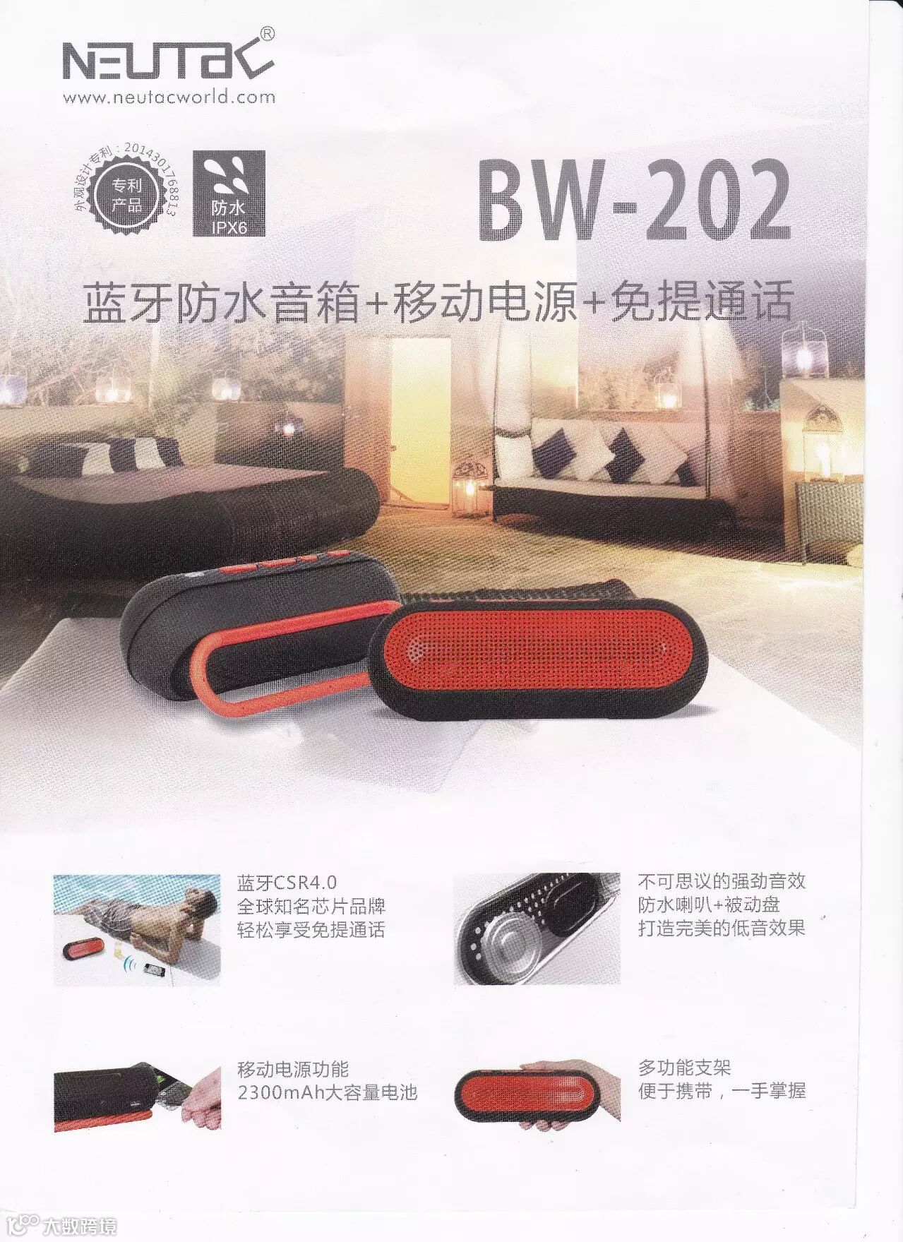 Neutac BW-202 高品质防水蓝牙音箱 带移动电源功能 采用全球最新蓝牙技术CSR4.0 防水6级 完美适合户外 海边 浴室等潮湿环境下使用