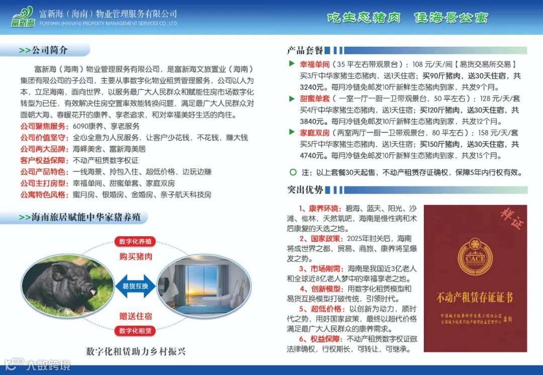 块钱,一家人吃一年市场上最好的生态猪肉,还能到海南免费住一个月的一线海景房,这样的价格特别具有市场杀伤力,市场接受度高,特别容易推广。