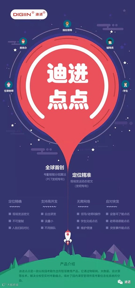 “迪进点点·校园智能考勤系统”采用了迪进自主研发的两大核心技术,“考勤智能分组算法”以及“现场发送动态密文”,能够精确定位,人脸识别,不易作弊,可支持50万人同时签到不卡顿,学生可在30秒内自动完成点名,老师基本零操作。对于信号不好的学校,不用怕,考勤定位终端无需网络,只需电源,维护更加方便。