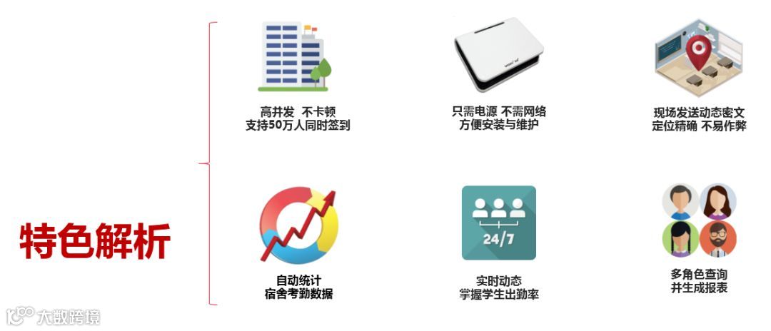 拥有六大特色:高并发、不卡顿,支持50万人同时签到;只需电源、不需网络,方便安装与维护;现场发送动态密文定位精确,不易作弊;自动统计宿舍考勤数据;实时动态掌握学生出勤率;多角色查询并生成报表。