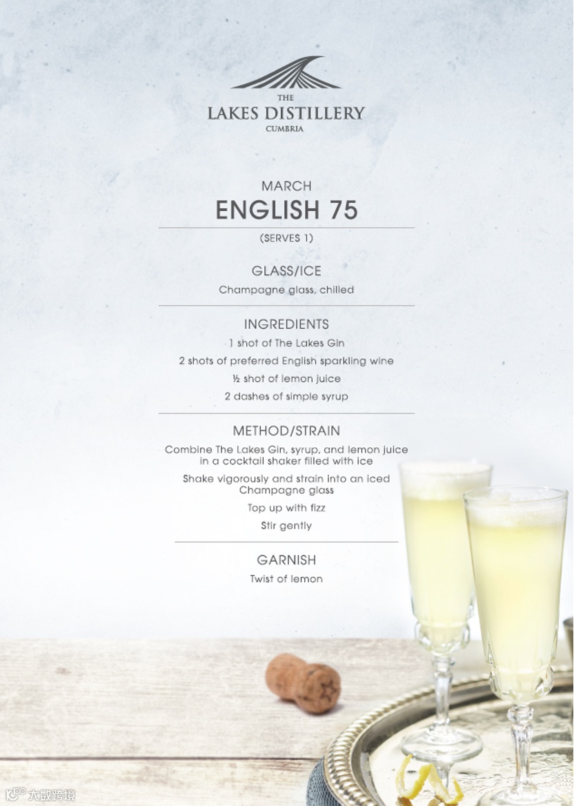 美味的英式75是法兰西75鸡尾酒的改版。法兰西75鸡尾酒得名于1897年一战期间发明的75mm野战炮,第一次于1925年出现在巴黎的哈里美式酒吧的酒桌上。Our English 75 cocktail recipe is a delicious twist on the Prohibition-esque French 75. The classic French recipe is named after the French ‘Canon de 75 modele 1897’ a weapon from the First World War, and first emerged at Harry’s American Bar in Paris, 1925. 我们用美味的英式气泡酒取代了传统的法国香槟,另这款鸡尾酒有了全新的口感。We’ve swapped the traditional French champagne for a delicious English sparkling wine to reinvigorate this sophisticated tipple. 记下配方,下一次开派对时亮一手!Find out how to give your next party a dash of sparkle with our recipe below! 英雷克斯接骨木花英式75鸡尾酒 The Lakes Elderflower & Mint English 75 Cocktail(1人份 / 1 serves) 30毫升 英雷克斯接骨木花金酒利口酒1 shot (30ml) The Lakes Elderflower Gin Liqueur 60毫升 英式气泡酒(根据个人口味选择)2 shots (60ml) of preferred English sparkling wine 15毫升 柠檬汁½ shot of lemon juice 2滴 糖浆2 dashes of simple syrup 冰镇香槟杯Chilled Champagne Glass 将英雷克斯接骨木花金酒利口酒,糖浆还有柠檬汁加入鸡尾酒摇壶中,加冰摇匀。Combine The Lakes Elderflower Gin Liqueur, syrup and lemon juice in a cocktail shaker filled with ice. 大力摇匀后倒入冰镇香槟杯中。在顶部淋上英式气泡酒,轻轻搅拌。大功告成!Shake vigorously and strain into an iced champagne glass. Top up your drink with fizz and stir gently. Voila!