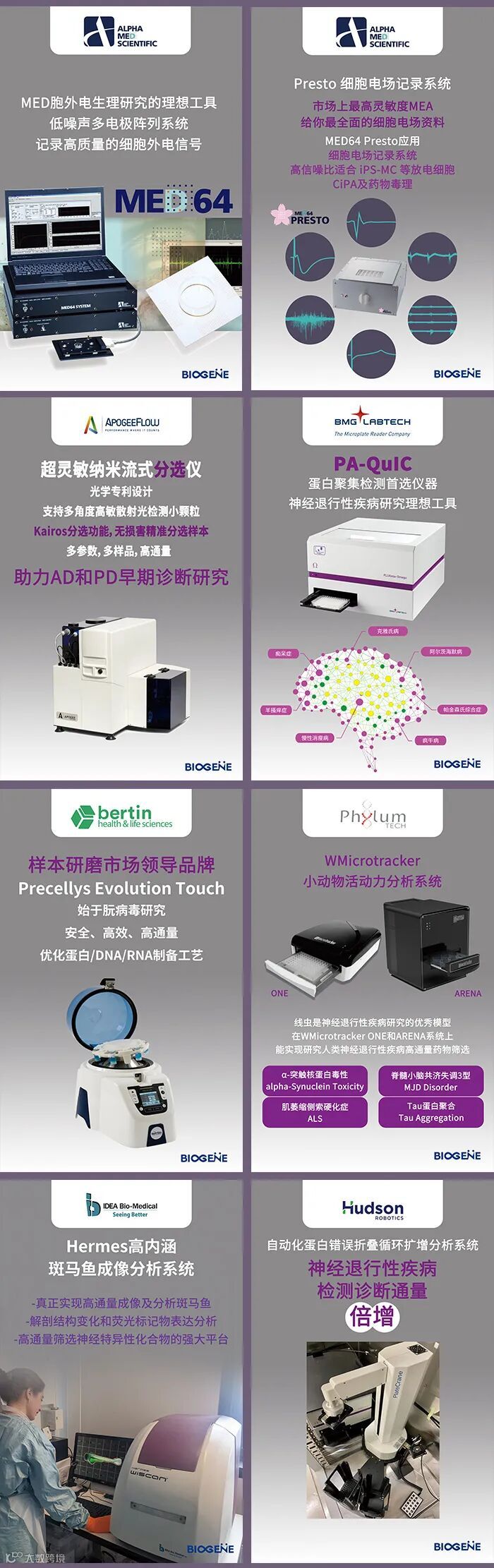 本次展会进科驰安科技将在B94号展位展示公司的主打产品:日本MED64微电极矩阵记录系统和MED64 Presto细胞电场记录系统、英国Apogee超灵敏纳米流式分选仪、德国BMG Labtech PA-QuIC检测系统、法国Bertin明星产品Precellys Evolution Touch生物样本研磨器、Phylumtech小模式动物活动力分析系统、以色列IDEA Bio-medical HERMES & Zfish 斑马鱼全自动高内涵成像系统和美国Hudson自动化循环扩增分析系统。进科驰安作为上述公司的长期合作伙伴,将在本次大会中带来最新的产品展示,并且有专门的销售和技术人员为大家现场答疑解惑。欢迎广大专家学者来B94展位莅临参观交流。