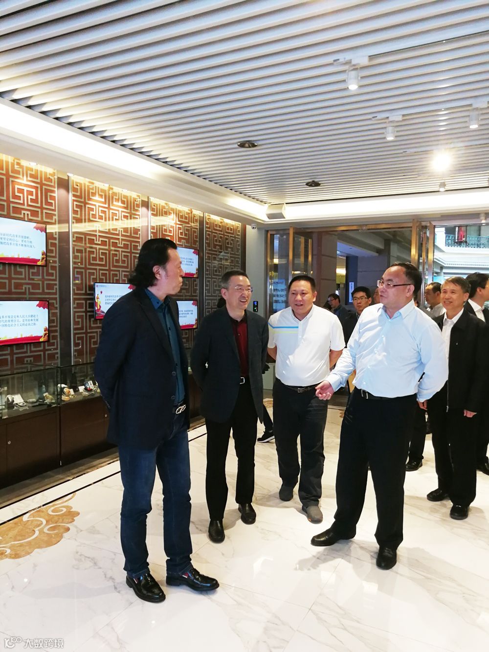 △ 中宣部版权管理局局长于慈珂、广东省委宣传部副部长王桂科和南方文化产权交易所总经理雷震等领导、相关负责人参观国家版权贸易基地(越秀)。