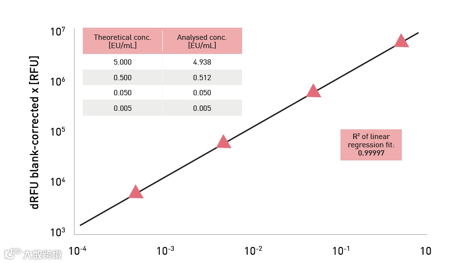 图3: 由预载在ENDOZYME II板上的标准品所生成的标准曲线,在VANTAstar中展现出极高的线性相关性(R² > 0.999)