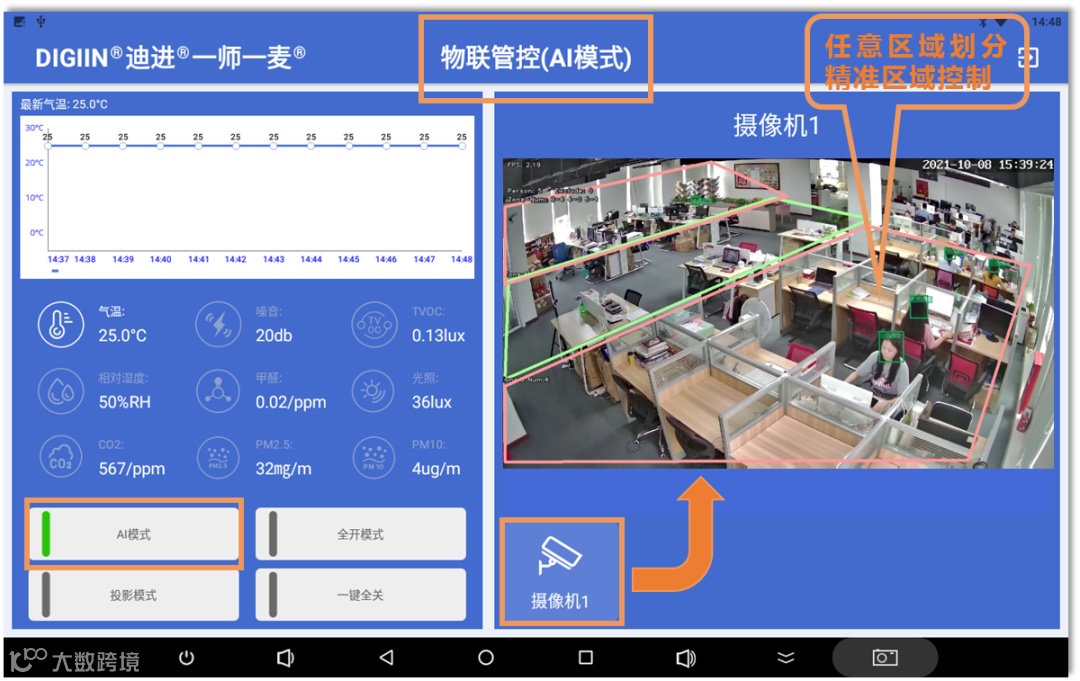 迪进®智慧办公充分运用大数据、云计算等现代信息技术手段,通过网络摄像头,读取网络视频流,对办公室监控画面进行视觉分析算法,通过无线物联网智能化控制各种设备,从而做到“无人托管”、“无为而智”,及时关灯、风扇、空调等基础设施,达到节能减排,节约用电,提供一个全面感知、智慧型的一体化智慧办公管理。