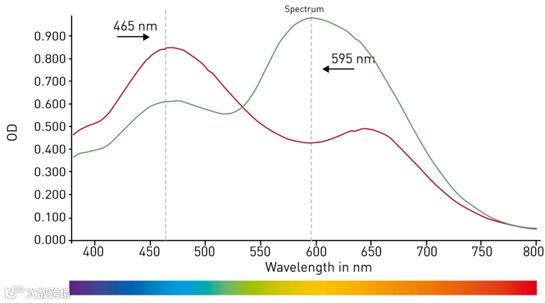 图3:用于Bradford测定法的考马斯亮蓝未结合(红线)和结合后(绿线)光谱。结合后,染料的最大吸收峰从465nm变为595nm。