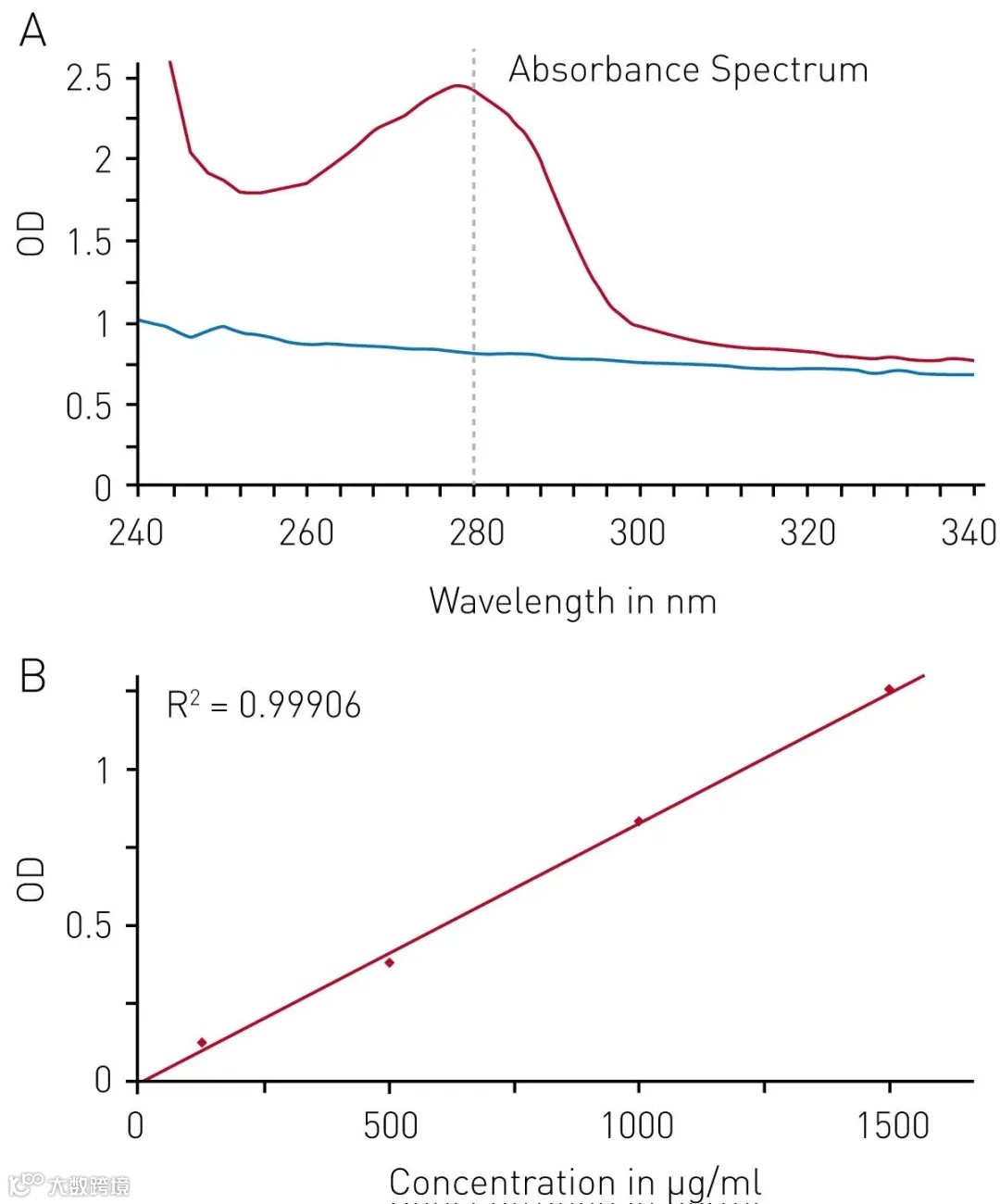 直接测定蛋白质的方法是测量样品在280nm波长处的吸光度。其原理是蛋白质中的色氨酸和酪氨酸等芳香族氨基酸残基会在280nm波长处吸收紫外线。由于这几种氨基酸的吸光度很高,因此无需再向样品中添加其他试剂,从而可以在根据现有氨基酸进行定量分析后重新使用提取物。不过,该方法需要量化蛋白质或蛋白质混合物的精确消光系数。消光系数取决于所含氨基酸的芳香残基量,是根据吸光度值计算蛋白质浓度所不可或缺的。A280法比较适用于高浓度样品。点击文末阅读原文,可查阅我们的相关应用说明 (AN299:使用BMG LABTECH仪器进行基于吸光度的蛋白质定量方法)。