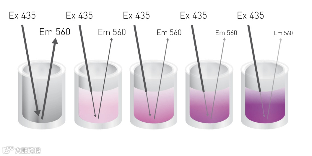 图4:BCA法荧光探测的Epi-absorbance原理。白色板具有特征性的荧光激发/发射波长。由于显色产物具有吸收光的能力,可利用该原理进行比色测定,将颜色变化量与检测到的荧光信号强度相关联。