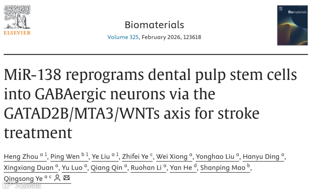 近日,武汉大学、武汉人民医院与悉尼大学联合科研团队在《Biomaterials》发表重要研究成果,为缺血性中风治疗提供了创新方案。该研究题为《MiR-138 reprograms dental pulp stem cells into GABAergic neurons via the GATAD2B/MTA3/WNTs axis for stroke treatment》,聚焦牙髓干细胞(DPSC)的重编程应用。