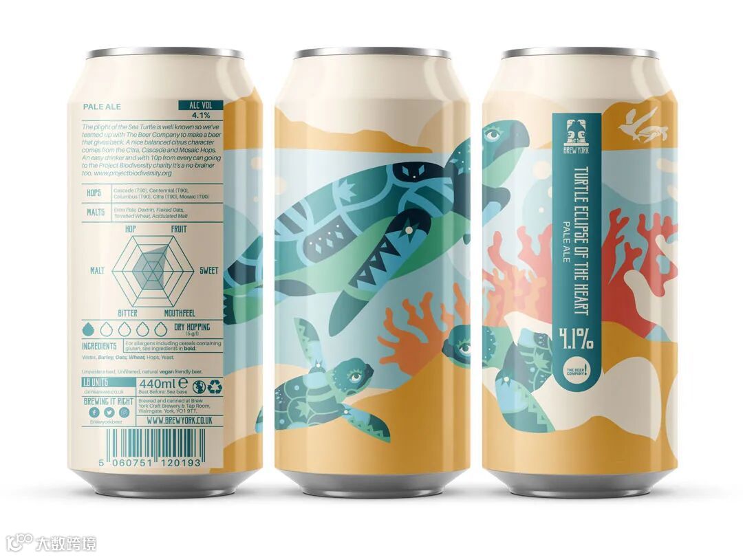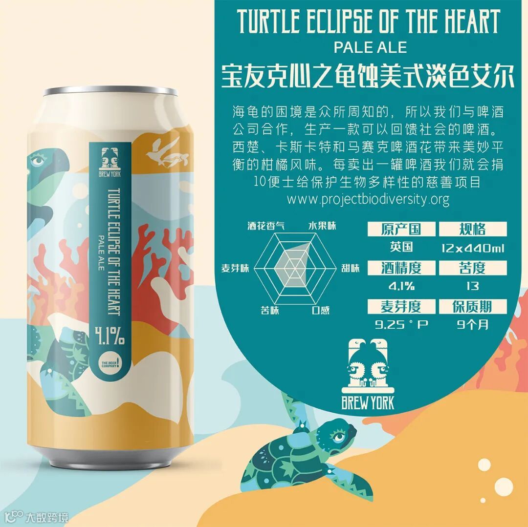 海龟的困境是众所周知的,所以我们与啤酒公司合作,生产一款可以回馈社会的啤酒。西楚、卡斯卡特和马赛克啤酒花带来美妙平衡的柑橘风味。每卖出一罐啤酒我们就会捐10便士给保护生物多样性的慈善项目www.projectbiodiversity.org