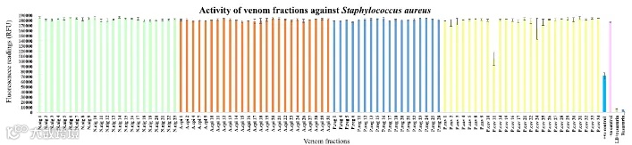 图4. 针对金黄色葡萄球菌的92种毒液组分的高通量抗菌活性筛选结果。