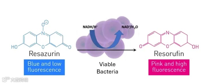 雷扎红是一种细胞活性检测试剂,具有荧光与比色双重检测功能。其为一种氧化还原(REDOX)指示剂,可广泛应用于细胞活力评估相关的实验中【3】。细菌的代谢活性可将雷扎红不可逆地还原为粉红色、具有荧光的雷扎夫林(resorufin)(见图1)。因此,可通过测定细菌的代谢活性,间接用于毒液组分中新型抗生素的筛选。