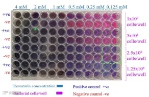 为确定雷扎红与菌液的最佳浓度,金黄色葡萄球菌以每孔 1.25 × 10⁶ 至 1 × 10⁷ 个细胞的密度接种。雷扎红母液用无菌蒸馏水稀释后加入孔中,最终浓度在 0.125 mM 至 4 mM 之间。随后在 120 分钟内读取雷扎红的转化率。