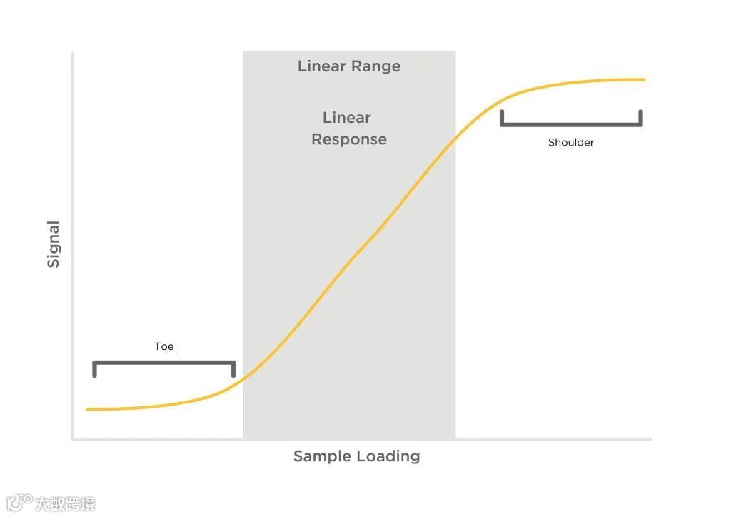 了解动态范围对于正确分析数据和解释蛋白质印迹结果至关重要。准确定量要求来自蛋白质条带的信号落在成像系统的线性范围内。条带强度与线性范围内蛋白质数量的关系是线性且成正比的。如果线性范围之外的信号很弱或太强,它们可能会受到噪声的影响,然后成像系统无法再准确记录增加的信号(饱和),如图所示。