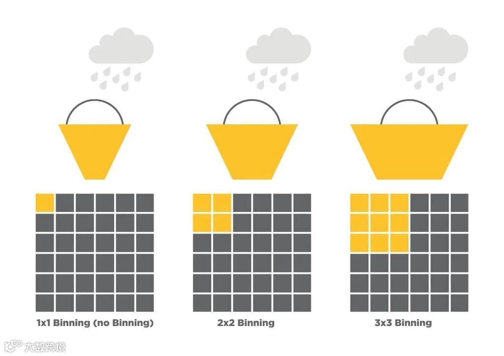 较小的像素可以合并,这意味着传感器上相邻像素的信号可以合并以创建单个更大的有效像素(称为超像素),从而提高灵敏度,从而缩短曝光时间。像素合并的缺点是它确实会导致分辨率损失。3 桶图形通过桶中捕获雨水来解释这一点。较大的水桶可以捕获更大的雨滴量; 因此,更大的像素可以捕获更多的光子。