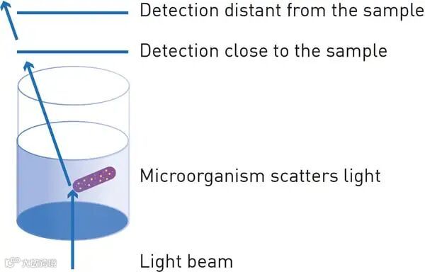 以吸收光模式测定颗粒的光散射时,使用不同的仪器得出的结果可能会有所差异。原因在于光束的类型不同,探测器与样品的距离也不同。可以想象,当通过微生物的光束发生散射,距离较近的探测器更容易捕捉到光线,而距离较远的探测器则有可能捕捉不到(图3)。因此,建议使用可用OD600来检测微生物生长过程的一系列专用仪器。
