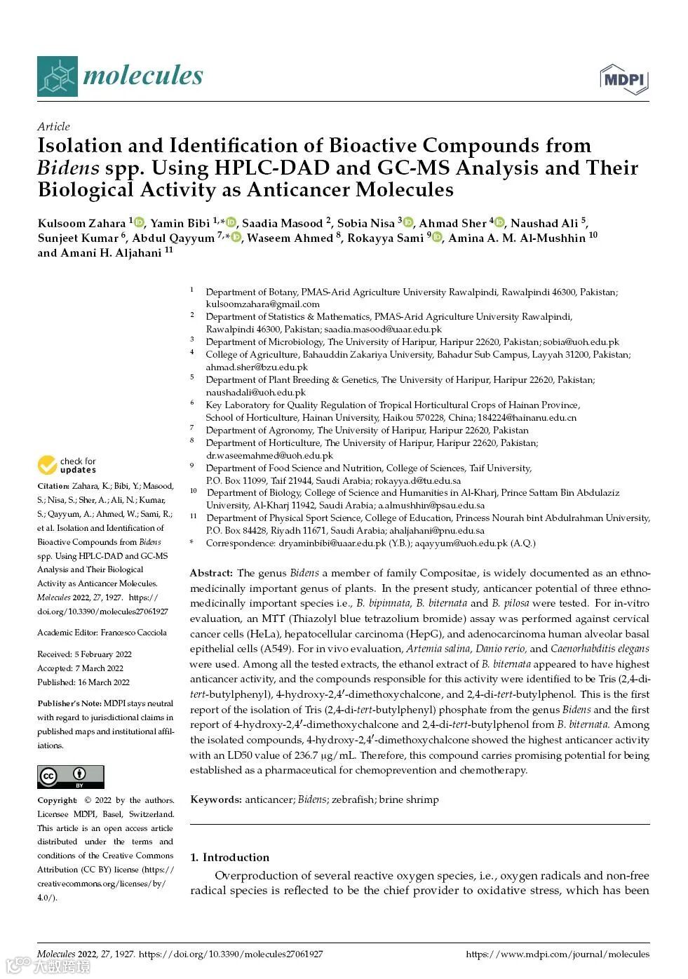 在Molecules,的第Volume 27, Issue 6 (March-2 2022)发表的文章中,一篇来自于巴基斯坦拉瓦尔品第农业大学植物学系Kulsoom Zahara等人撰写的文章《Isolation and Identification of Bioactive Compounds from Bidens spp. Using HPLC-DAD and GC-MS Analysis and Their Biological Activity as Anticancer Molecules》中,成功地将WMcirotracter小动物活力分析系统应用于生物活性分子的生物毒性研究:研究者们分别用线虫和斑马鱼作为实验动物模型,对多种鬼针草属植物提取物进行体内毒性分析,获得了大量的支持数据。为人类从天然植物提取物中寻找安全、有效的药物提供高效、经济的方法。