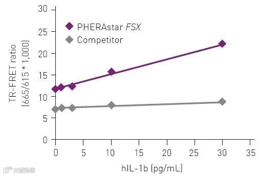 IL-1β 标准曲线的低浓度的一部分。使用PHERAstar FSX,在 0-30 pg/mL 范围内有一个明确的信号增加,可区分非常低的浓度。