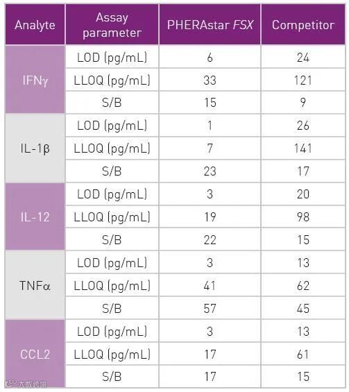 人类细胞因子的检测极限 (LOD) 和最低检测量(LLOQ)的评估, PHERAstar FSX与其他竞争品牌相比,FSX 表现出更高的检测灵敏度,LOD可达到个位数 pg/mL。这些数据表明PHERAstar FSX 特别适用于THUNDER™ 细胞因子定量。