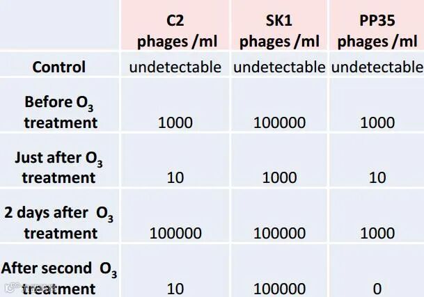 臭氧处理对C2这类噬菌体有明显作用,每个处理之后含量下降至每毫升10个;臭氧处理对SK1这类噬菌体作用不太明显,第二次处理没有明显变化,原因可能为这类噬菌体浓度太高或者对臭氧有抗性。