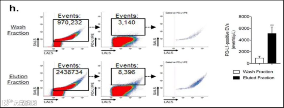 图1,PD-L1抗体偶联微球捕获EVs。Wash和Elution级分PD-L1表达阳性EVs分析[1]