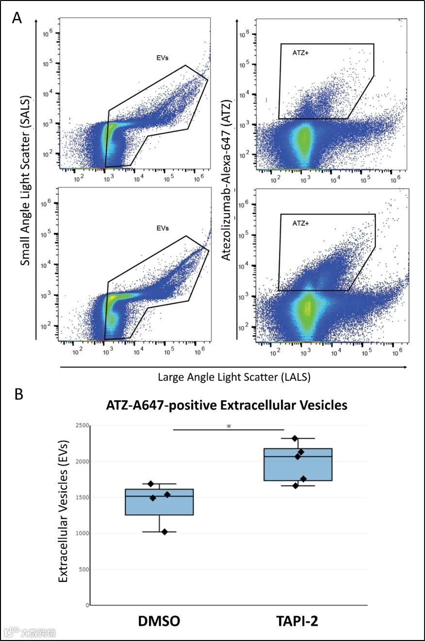 图2,不同药物处理条件下,ATZ-A647标记的PD-L1 EVs定量分析[2]