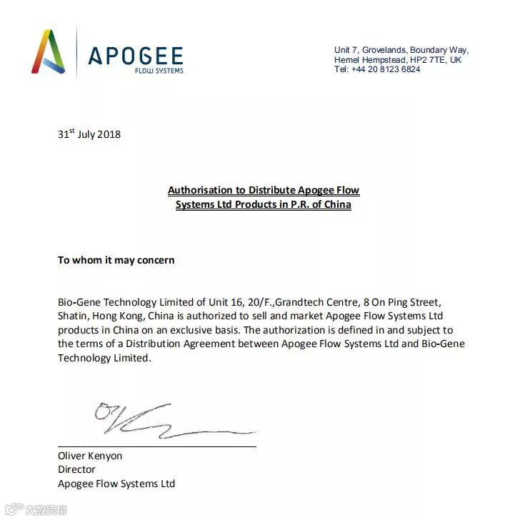 英国Apogee成立于2000年,其总部位于英格兰的赫默尔亨普斯特德。产品制造以BS EN ISO 13485:2003医疗设备生产质量管理体系为基础。伯齐科技有限公司作为英国Apogee在中国的独家授权代理商,积极开拓中国市场。通过几年推广,Apogee已成为国内纳米流式和外泌体研究认可的品牌。伯齐科技已先后让Apogee纳米流式分析仪在国内多个科研单位,如中国计量科学研究院,中科院微生物研究所,北京大学医学部,上海第二军医大学,中科院哈尔滨兽医研究所,杜邦北京公司等单位落户,为国内众多用户外泌体胞外囊泡,食品微生物等纳米样品分析提供了大量成功应用方案。英国Apogee厂家对伯齐科技的推广成果表示高度认可!