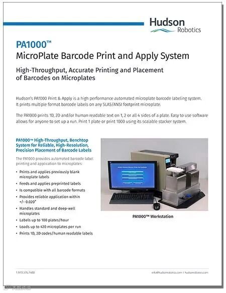 hudson的PA1000 Print&Apply是一个高性能、自动化微孔板条形码标签系统。它可在任何SLAS/ANSI规格的微孔板上打印不同格式的条形码标签。