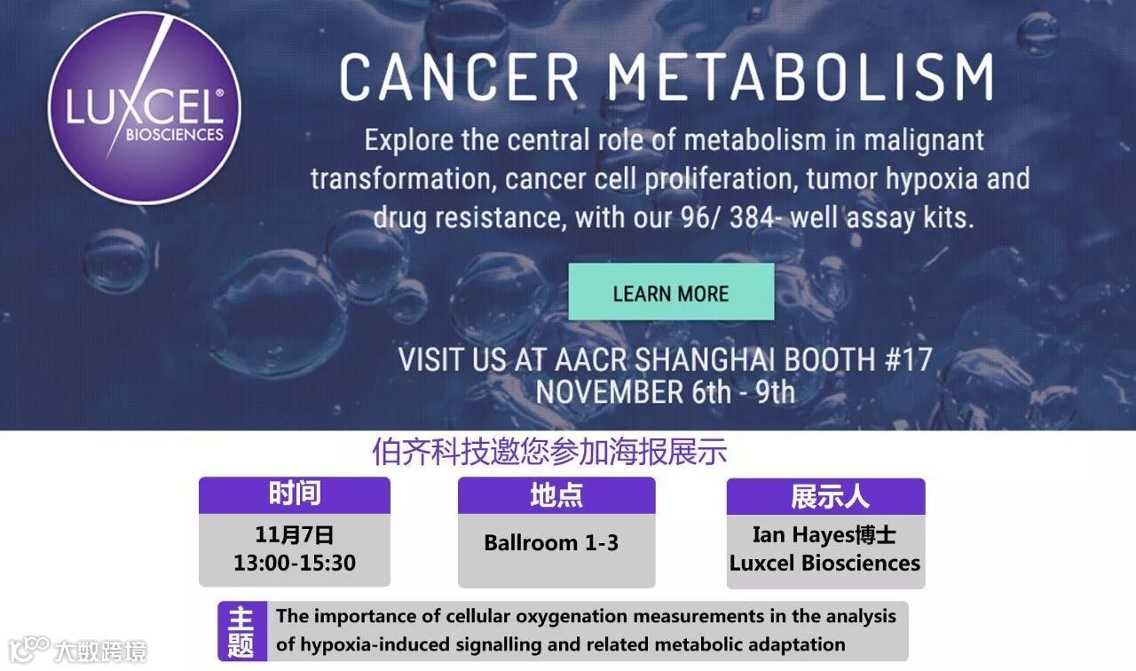 同时,11月7日13:00-15:30在Ballroom 1-3, Luxcel Biosciences厂家的Ian Hayes博士将会在现场为大家展示海报,题目为“The importance of cellular oxygenation measurements in the analysis of hypoxia-induced signalling and related metabolic adaptation”,欢迎感兴趣的专家学者前往参加!