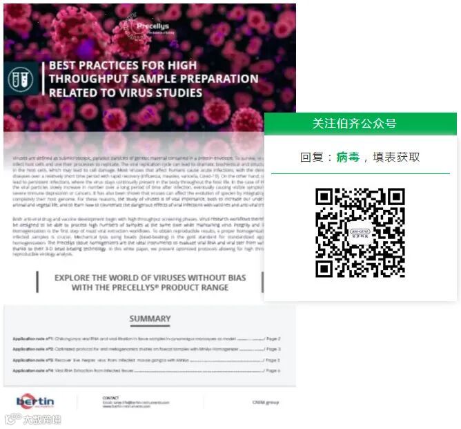 法国Bertin整理了一份关于Bertin生物样品研磨器病毒研究白皮书,在这篇白皮书中,从实例出发提出了一些病毒研究的优化建议,从而实现高通量和可重复的病毒学分析。