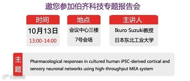 本次展会,伯齐科技将携手日本Alpha Med Science公司共同参加。同时,我们将于13日13:00-14:00在会议中心三楼7号会场举办卫星会议,我们邀请了日本东北工业大学的Ikuro Suzuki教授做专题讲座,题目为“Pharmacological responses in cultured human iPSC-derived cortical and sensory neuronal networks using high-throughput MEA system.”,欢迎感兴趣的专家学者前往参加!