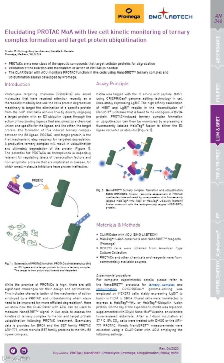 该方案通过BMG多功能酶标仪CLARIOstar Plus-ACU,在活细胞上结合NanoBRET 技术,对利用PROTACs降解靶标蛋白的关键步骤可实现精准实时监测。