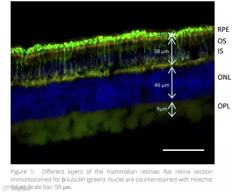 哺乳类动物的视网膜分为10层。视网膜由视网膜里面的神经节细胞和视网膜外面的视杆细胞和视锥细胞构成。从里到外,视网膜层数被分为内极限膜(ILM)、神经纤维层(NFL)、神经节细胞层(GCL)、内网层(IPL)、内核层(INL)、外网层(OPL)、外核层(ONL)、外界膜(ELM)、视杆和视锥内外段(IS/OS)、视网膜色素上皮细胞(RPE),如图1所示。视网膜层厚度的检测对于视网膜解剖研究至关重要,特别对于药物试验,这里推荐使用Incellis细胞智能成像系统来测量视网膜层的厚度。