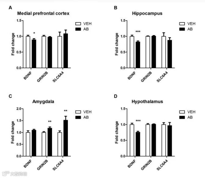 AB为抗生素处理组,VEH为对照组,分别检测了BDNF(脑源性神经营养因子)、GRIN2B(天冬氨酸受体亚基)、SLC6A4(羟色胺转运体)在A组(中间前额大脑皮层)、B组(海马体)、C组(扁桃体)、D组(下丘脑)4个部位里表达水平的变化。