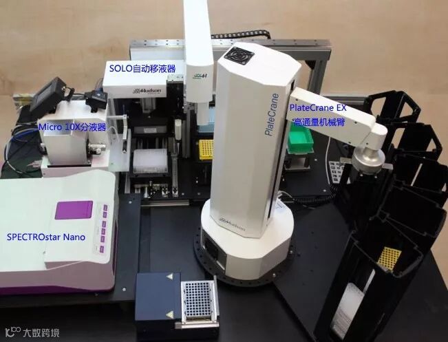 对此,德国BMG公司利用其专利的超快速全光谱检测酶标仪(SPECTROstar Nano)和美国Hudson Robotics Inc公司全自动移液工作站(SOLO自动移液器,Micro 10X分液器以及PlateCrane EX Robotic Arm高通量机械臂)开发出高通量自动化pH检测方案(图1)。