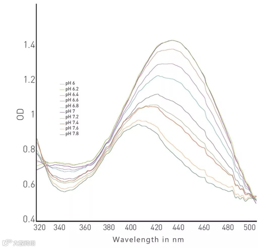 该方案利用pH指示剂溴百里香酚蓝在不同酸碱环境下有不同吸收光谱这一特性进行精确定量。溴百里香酚蓝有两种存在形式:基础形式在620nm附近有最大吸收峰,中性形式在400-430nm有最大吸收峰。以往的方案中,利用基础形式的溴百里香酚蓝测定pH的比较常见。然而这种检测单一最大吸收波峰的方案,非常容易受溶液各种因素的影响,任何微小体积变化,溶液成份变化,都会影响最大吸收波长测定结果。本次介绍的新方案利用中性形式的溴百里香酚蓝,通过测定其在不同pH溶液中的吸收光谱信息(图2),快速准确测定溶液pH值(图3)。