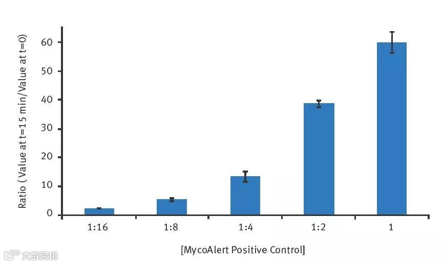 CLARIOstar酶标仪具有超高的检测灵敏度,即使MycoAlert阳性对照被稀释16倍,依然很轻易的检测出支原体的存在。